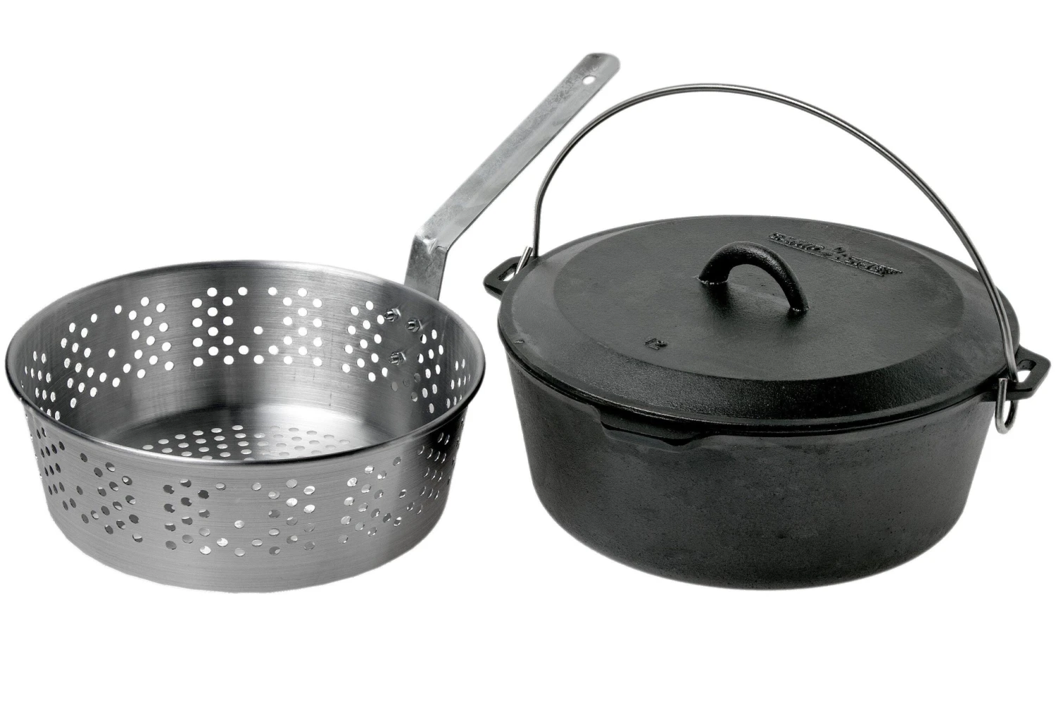 Grâce à cette friteuse Camp Chef, préparez vos snacks préférés : frites, beignets, et autres produits de friture. Ou utilisez-la simplement comme marmite pour cuisiner (en extérieur). Sur le feu de camp, sur une gazinière ou dans le four. La marmite n’a pas de pieds et se pose de façon stable sur une grille de four ou sur une gazinière. Les propriétés uniques de la fonte garantissent une excellente répartition de la chaleur. Elle est livrée avec un panier de friture avec poignée et un couvercle. La fonte a été traitée selon le traitement ‘true Seasoned Finish’. La finition est donc lisse et les ustensiles de cuisson sont immédiatement prêts à l’emploi.