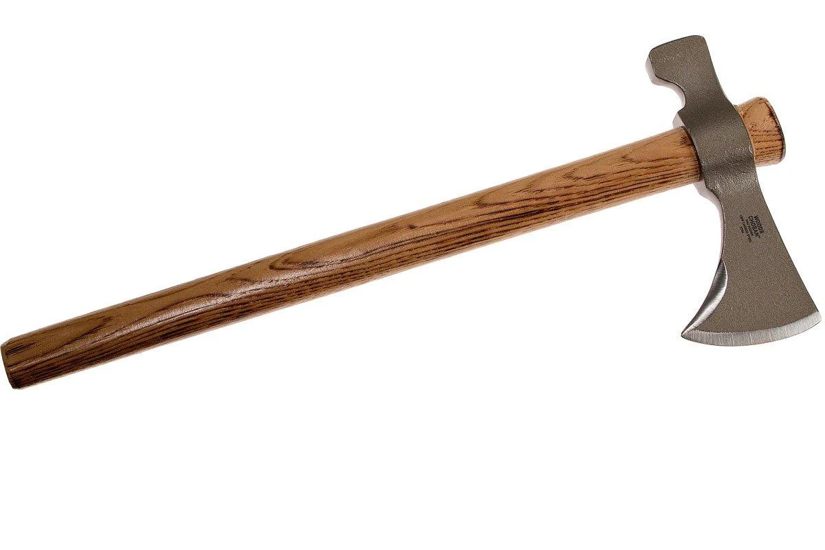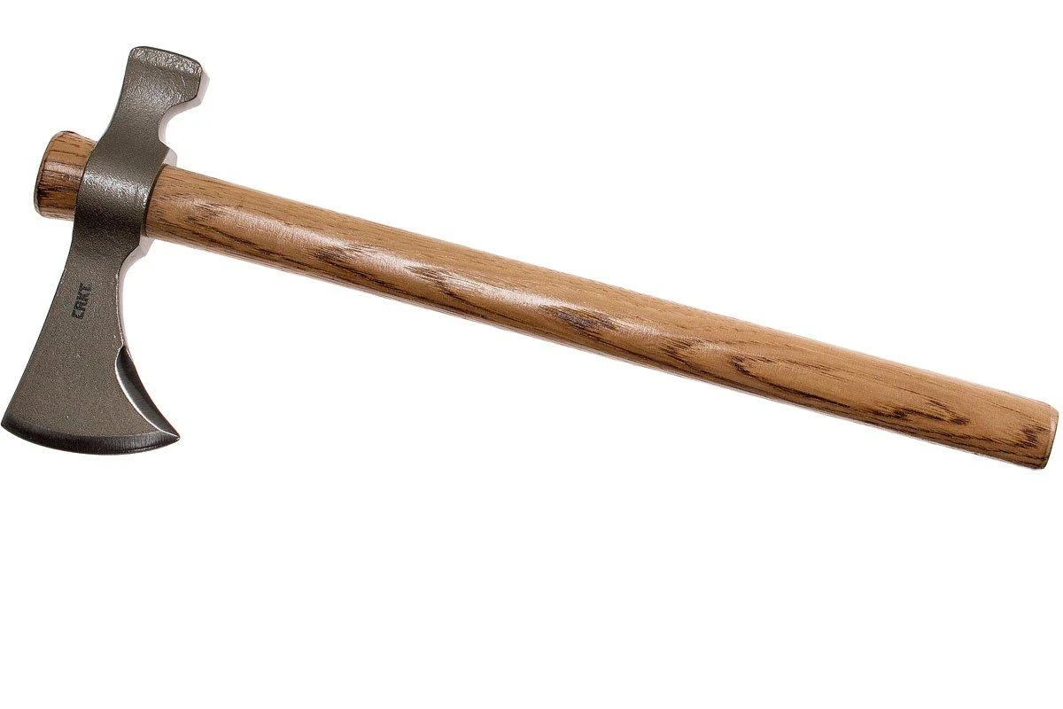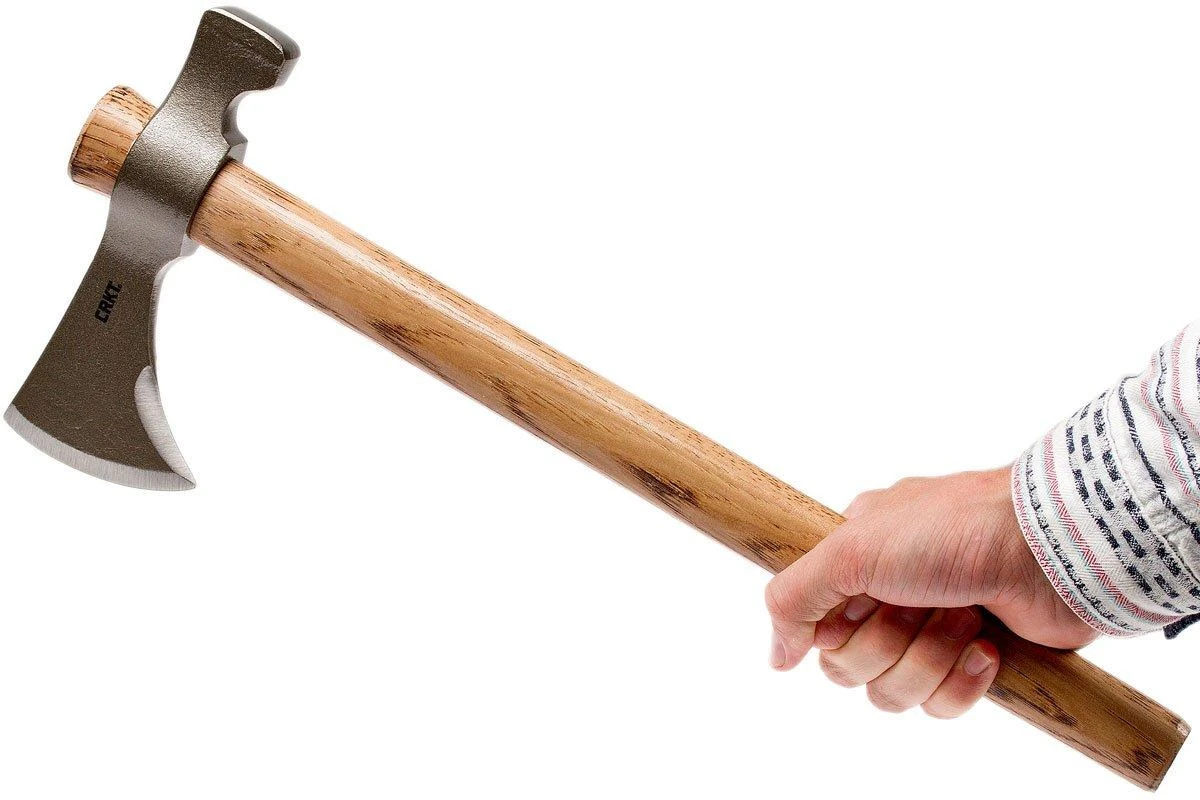 La CRKT Woods Kangee T-Hawk 2730 est une hache conçue par Ryan Johnson. Ce designer américain est spécialiste dans le domaine des haches depuis plus de 30 ans. La tête de hache en acier au carbone a un tranchant durci aiguisé comme un rasoir pour une utilisation très robuste. L’arrière de la tête de hache sert de marteau. Le manche en bois est « all-american made » (entièrement américain). Plus précisément, le manche est fabriqué par la société Tennessee Hickory. Ce type de bois est très résistant aux forces brutes qui se dégagent lors de l’utilisation. Il tient très bien en main et est pourvu d’une couche de laque protectrice. Le manche se prolonge légèrement dans la tête de hache. Vous pouvez facilement déposer la hache sur ce dernier. Cette hache robuste est faite pour une utilisation intensive !