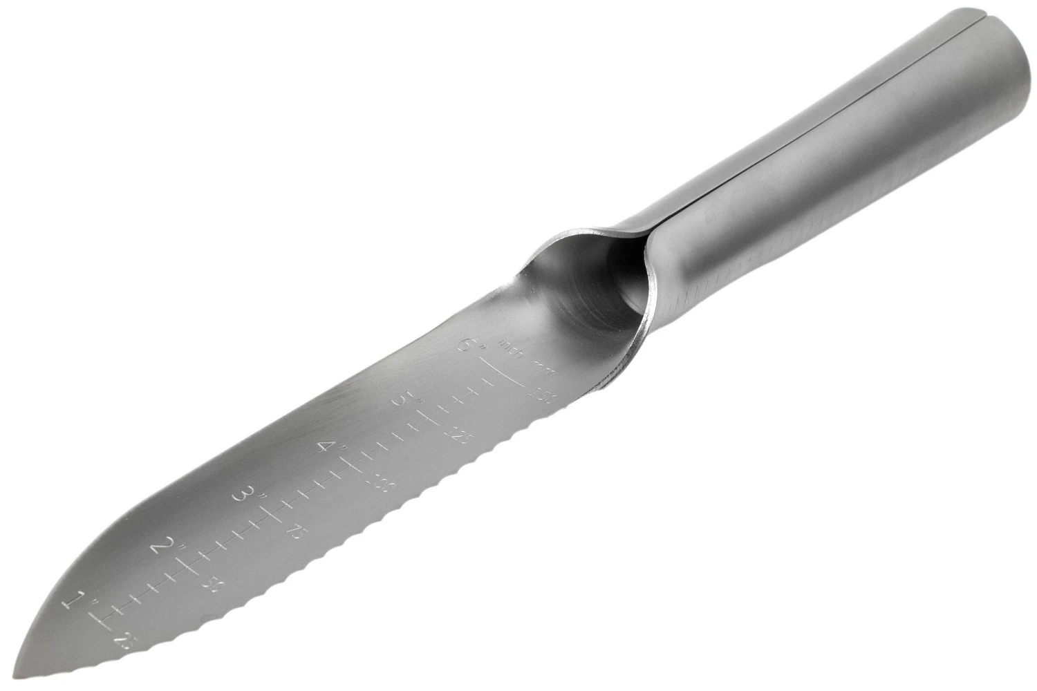 Le Nisaku Hori Hori 6800 est un couteau de jardin luxueux, fait d’une pièce en acier inoxydable, selon la tradition Japonaise. L’avantage de cette construction de couteau est sa solidité. La lame en acier inoxydable garde son tranchant longtemps et n’est pas trop sensible à la corrosion. La poignée est décorée de rayures en croisillons qui améliorent sa prise en main. Ce manche étant assez gros, ce n’est pas le choix idéal pour les petites mains. L’Hori Hori 6800 est livré avec son fourreau luxueux en cuir.