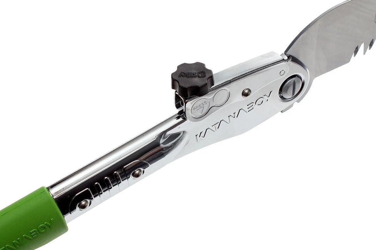 La Silky Katanaboy 650-4 est une très grande scie pliante dont les performances sont très proches de celles d’une tronçonneuse. Grâce à elle, même les branches difficiles d’accès sont à portée de main. Cette scie pliante porte le nom d’une épée japonaise en raison de sa longueur exceptionnelle de 65 cm. Tout comme le Katana, l’acier a un noyau en métal souple. Il est donc très flexible et pénètre le bois en toute facilité. La couche extérieure est en acier dur assurant une excellente conservation du tranchant.